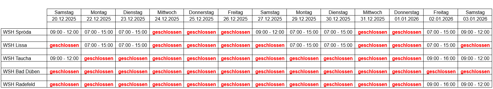 anbei finden Sie die Öffnungszeiten zum Jahreswechsel.